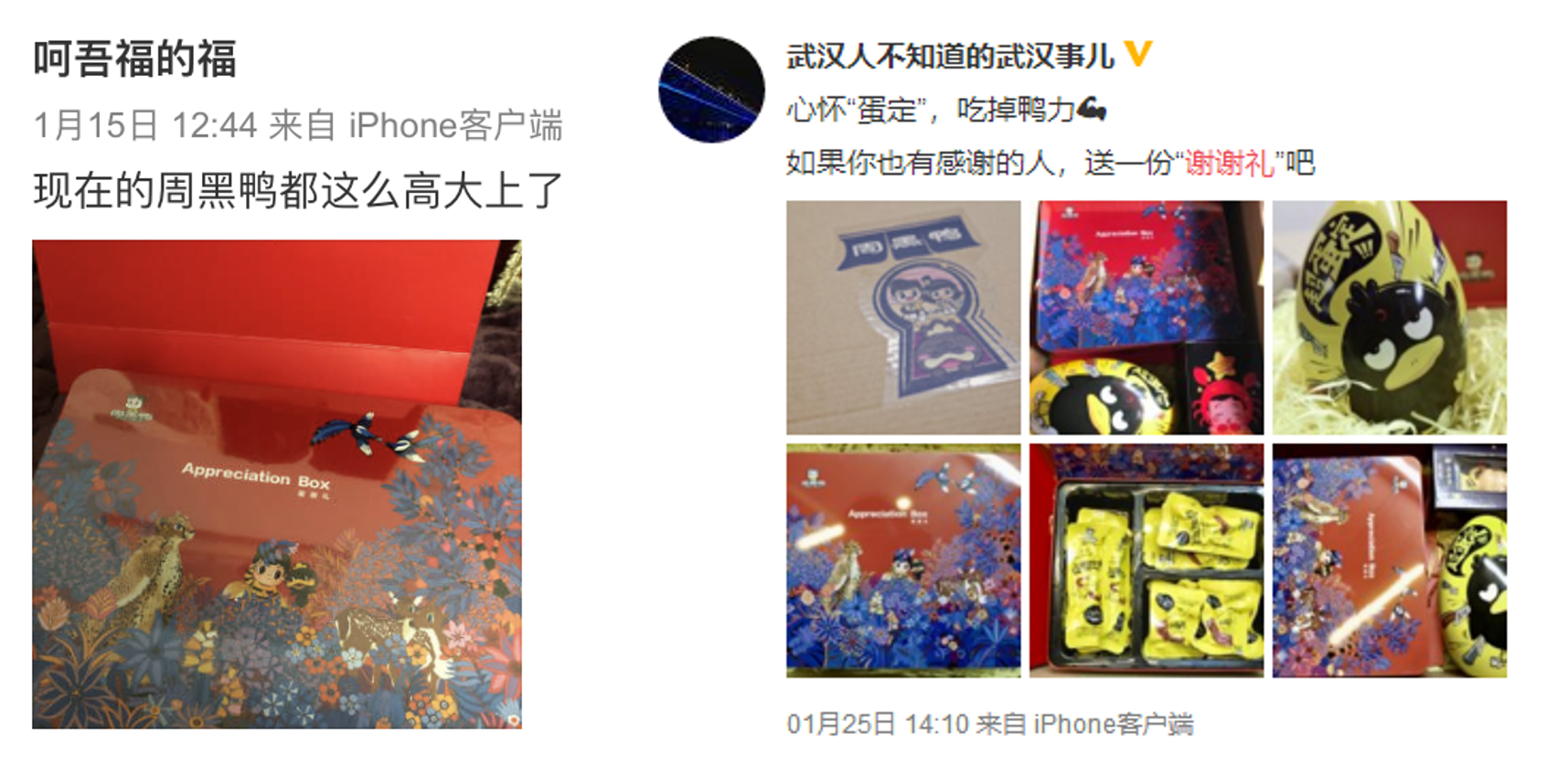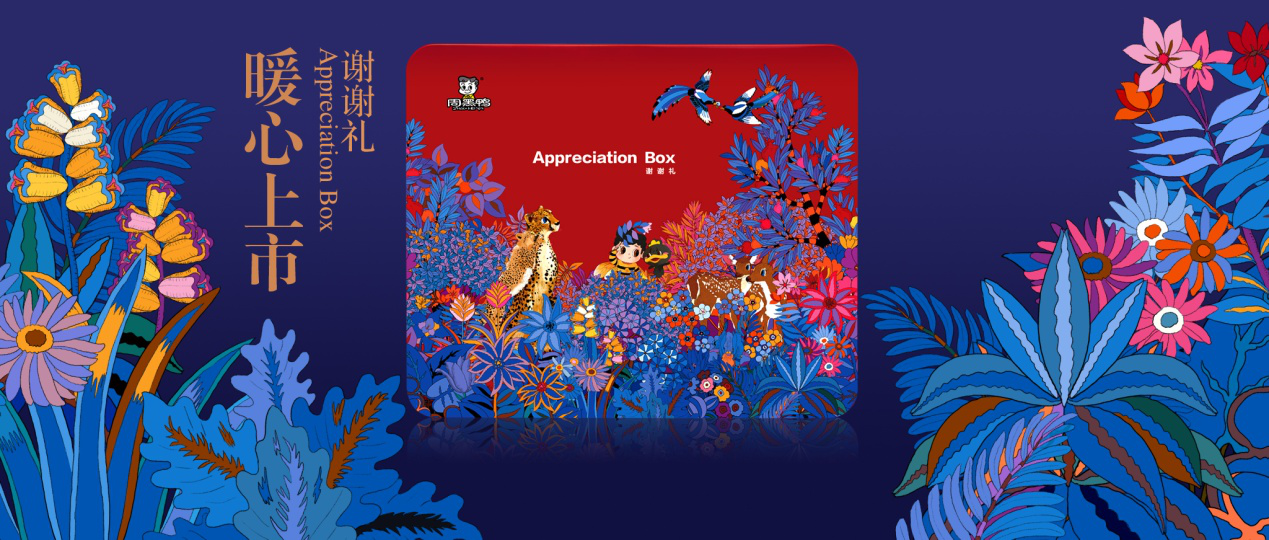 畫面中一大一小的兩只豹子、親密無間的梅花鹿和相互嬉戲的喜鵲分別代表了親情、友情和愛情。除了借由禮盒對朋友表達感謝之情外,同樣還可以贈送給親人和愛人。正中是代表品牌的卡通人物和鴨子,蘊意無論何種關系,作為傳情達意的載體,都可以是周黑鴨“謝謝禮”禮盒