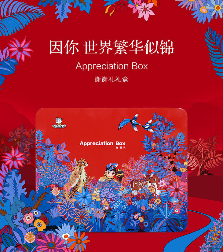 禮盒以紅色為主,希望給到人們溫暖的感覺。通過手繪的形式,描繪出一副五彩斑斕、栩栩如生的童話世界,通過動物之間的關系,以及他們在花叢中的不同形態(tài),間接的表達出我們想對Ta說的話: